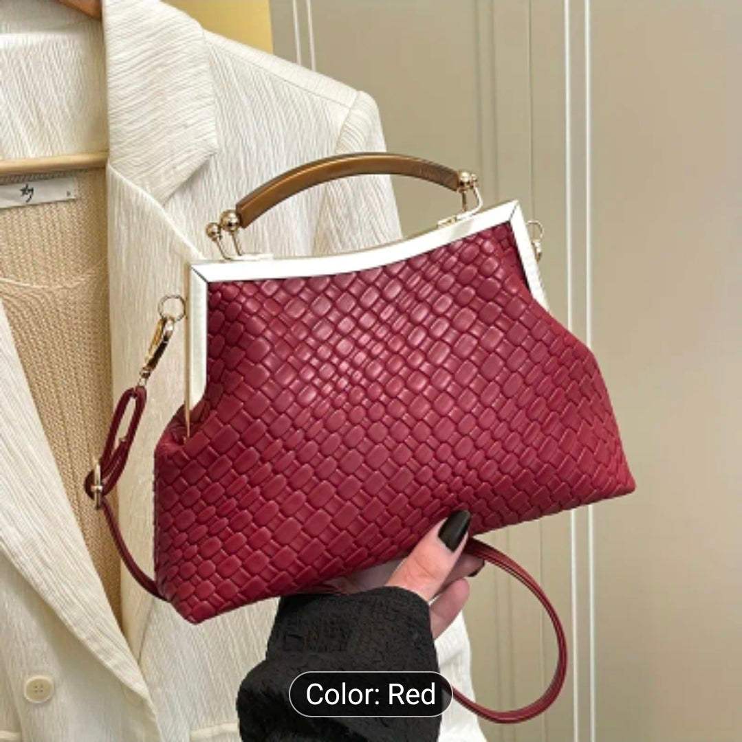 Featuring a luxury woven texture finish and a structured gold frame, this handbag blends sophistication with versatility. Whether carried as a chic clutch or worn with the detachable strap for hands-free ease, it adapts perfectly to your lifestyle.